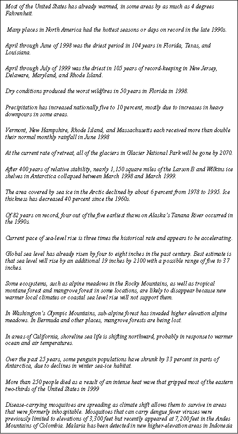 Computer Climate Models predict that surface air temperatures will increase with a range from 1° - 5° Celsius, with a mean of 3.5° C. In addition, these models show that average precipitation will increase (but the rise in evaporation from warmer temperatures is predicted to overwhelm this precipitation, and soil moisture levels are thus predicted to decrease). [A link to studies on the consequences of global warming] [A map of where the consequences of global warming are happening] The world's answer: